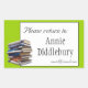 This design has a cut out photograph of hardback books. The text reads "Please return to: Your Name, your@email". All text is easily personalised. It's possible you might want to move it around or resize things and that can be easily done - just click the 'customize' button. You can also change the background colour.