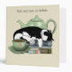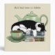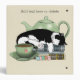 A cute black and white tuxedo cat sleeping on a pile o books with a green teapot in behind and a cup of tea in front.