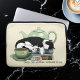A cute black and white tuxedo cat sleeping on a pile of books with a green teapot on behind and a cup of tea in front