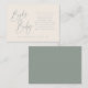 This Books for Baby card features the text Books for Baby in a sage green color script typography and has editable text to request books and includes shower information. Additional colors, games and enclosures are available in our zazzle shop. Contact us through Zazzle for additional customization.
