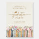 Books Graduation Welcome Sign. Make a grand entrance with a graduation party welcome sign that exudes timeless charm and literary elegance. This design creates a warm and inviting atmosphere, featuring stunning handpainted watercolor books and wildflowers in soft pink, blue, green, and gold. The vintage typewriter font and sophisticated gold script add a refined touch, setting the perfect tone for the celebration. Customize the text, fonts, and background to match your event’s theme and make your welcome truly special. Start designing today and greet guests in style!