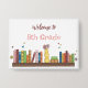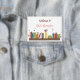 A white pin button with watercolor books on a shelf . Great for welcoming your young students on the first day of school . Also available in black and teal colors .