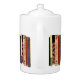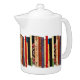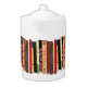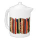 This brilliantly colored white porcelain teapot features a shelf of colorful books. They form an interesting abstract vertical geometrical pattern in colors of green, brown, yellow, red, blue, black and pink.