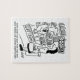 Fun jigsaw puzzle. A woman asks a shopkeeper in a bookstore what he has for a man who knows everything. Funny cartoon by UK cartoonist Nigel Sutherland.