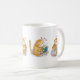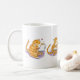 A bookstore cat finds a good book to buy and take home to read in a cozy place while having a beverage in a mug.