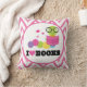 This adorable book pillow has pink and white chevron zigzag background with cute bookworm and I love books slogan.