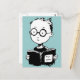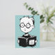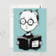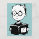 black and white illustration of a young boy in glasses holding a book open and looking up.