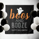 Modern and cute "Boos and Booze" Halloween party backdrop tapestry sign features text in orange, charcoal gray, and white lettering with a little ghost accent.