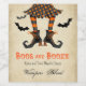 A fun idea for your Halloween Party, this wine label features a whimsical witch in striped stockings and polka dot skirt dropping into the scene with bats flying around her. Bold eerie "Boos and Booze" text is added with additional sub-text that can be personalized with your desired wording. The wine vintage is shown as "Vampire Blood". This can be edited if you wish to use other text.