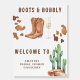 This design features modern neutral colors in a watercolor application. Design in cow print, glass of champagne, desert cactus, cowboy boots.