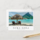Photo postcard of two sunloungers chairs under a thatched parasol on a beach with a view towards Bora Bora island, Tahiti, French Polynesia with in a white box the text: 'Bora Bora, French Polynesia'.
