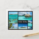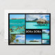 Postcard of a collage with multiple photos of beaches, overwater bungalows and underwater action on the tropical island Bora Bora near Tahiti in French Polynesia in the Pacific Ocean in a black frame with the text: 'Bora Bora'.