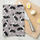 Cute black and white border collies sit, stay and rollover on a gray background with pawprints, a fun dog themed pattern.