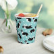Cute black and white border collies sit, stay and rollover on a blue background with pawprints, a fun dog themed pattern.