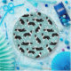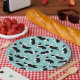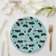 Cute black and white border collies sit, stay and rollover on a blue background with pawprints, a fun dog themed pattern.