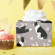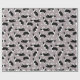 Cute black and white border collies sit, stay and rollover on a gray background with pawprints, a fun dog themed pattern.