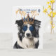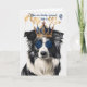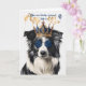 A very happy and smiling Border Collie is offering the birthday dude a kingship for his special day by wearing blue sunglasses and a crown upon it's head.