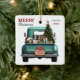 A teal blue retro pickup truck carries a decorated Holiday tree and gift packages on this cute ceramic Christmas ornament. Looking out from the tailgate is a beautiful black and white Border Collie dog. A rustic wooden sign on the back bumper says "Christmas Cheer". The red and green stylized text at the top left says "MERRY CHRISTMAS", with your name (or your dog's) and the year at the right. Both sides have the same image.