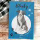 Border Collie Drawing Paw Merry Christmas kitchen towel. Fun and cute border collie drawing. The background is blue with white snowflakes and black paw prints. Personalize the towel with name and year. A lovely holiday keepsake for a border collie owner.