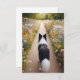 A flat card I created using an image I made using AI technology. A border Collie walking along a garden pathway.