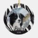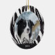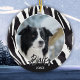 Border Collie Fur Pattern Dog Name Photo Christmas Ceramic Ornament. The background is black and white border collie fur pattern. Personalize the ornament with your dog`s photo, name and year of birth. A lovely holiday keepsake for a border collie owner.