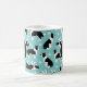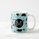 Cute black and white border collies sit, stand and lay with scattered paw prints on a blue background with your own custom monogram.