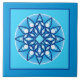 Ceramic tile in a twelve point mandala pattern in shades of turquoise, navy, and cobalt blue , accented in white, with a cobalt blue border