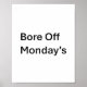Add a splash of humor to your week with our "Bore Off Monday's" poster! Featuring a bold, sarcastic quote, this eye-catching design is perfect for brightening up your office or home space and giving Monday the attitude it deserves.