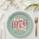 Add a touch of retro flair to your born in 1976 50th birthday party with party table decorations featuring paper plates adorned with a disco ball in pink shades against a teal blue background!