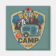Retro badge style camping graphic features retro rv trailer with mountains and trees and "born to camp" text on dark aqua background
