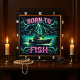 This artwork showcases a fearless fisherman in a boat, braving a dramatic and beautifully colored storm on a lake. The bold graphic style and striking color scheme of purples, teals, and pinks make the scene pop with energy. The design is an ode to the dedication of anglers everywhere. The phrase "BORN TO FISH" is written in a stylized pink. The entire scene is framed by glowing, decorative fish and foliage, giving the artwork a powerful and energetic feel.