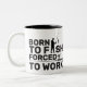 this design is presenting a funny saying by a fisherman who says "born to fish forced to work" who loves doing his passion with freedom