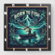 This is a bold and dynamic illustration with a central fishing theme. The design features a person in a small boat on a lake at night, surrounded by an impressive display of electric lightning bolts. The phrase "BORN TO FISH" is written in a stylized banner at the top. The entire scene is framed by glowing, decorative fish and foliage, giving the artwork a powerful and energetic feel.