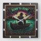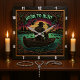 A powerful illustration of a hunter on a lake under the cover of a dark, tooled, neon-colored sky. He is in a small boat, surrounded by several ducks. The mountains and a lone bird overhead add to the overall atmosphere of a solitary and determined pursuit. The phrase "BORN TO HUNT" is prominently displayed at the top of the artwork.