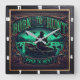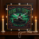 This is a stylized illustration with a tooled leather-like texture and a hunting theme. It features a man in a boat on a dark lake, holding a rifle and surrounded by ducks. The background includes mountains and a glowing sky, all rendered in a dark neon color palette of teal and orange. The phrase "BORN TO HUNT" is prominently displayed at both the top and bottom of the artwork.