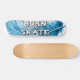 Cool skateboard featuring the wording "Born to skate" in a white modern graffiti font on a light blue feather background.