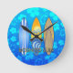 Retro Born To Surf. 3 vintage style surfboards with the message Born To Surf. Ocean blue background with Hawaiian Honu Sea Turtles and blue hibiscus flowers.