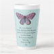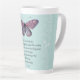 Inspirational quote latte mug with watercolor purple butterfly on light blue and white patterned background.