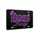 A pink and purple Boss Lady logo design with blingy sparkles on a black background (or color of your choosing) is printed on vanity license plates, gift mugs, apparel , hats and makes a great gift for business women, moms, aunts, sisters, female entrepreneurs.