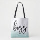 Show 'em who's boss with our super cute typography tote bag! White tote features a sheer watercolor wash background in pale sea green with "boss" in black handwritten marker style typography. Makes a great gift for recent grads, new jobs or promotions!