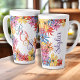 Tall latte mug to personalize for a woman boss. Colorful, illustrated flowers are printed on a white mug with "Boss" wording and a template for her name on the other side.