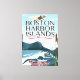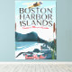 Boston Harbor Massachusetts, USA vintage style cartoon travel poster featuring a classic light aircraft flying over the islands.