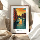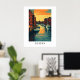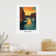 Illustrated poster of Boston's harbor at sunset with brick buildings, calm water reflections, and white sailboats docked along the pier.