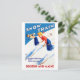 Restored and digitally enhanced vintage travel poster showing a couple skiing down a mountain. Snow Train. Colors corrected. Imperfections removed.