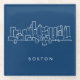 This design features a hand drawn sketch of the Boston skyline on a brown background.