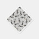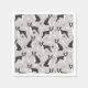 Cute Boston Terrier dogs with black and white coats sit and stand scattered dog bones and paw prints pattern.