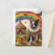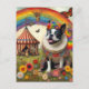 An adorable Boston Terrier in a field of wildflowers with a circus tent in the background wears a floral crown AI generated art
