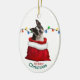 On the front of this Holiday ornament is an image of an adorable black and white Boston Terrier dog in a red and white Christmas gift bag. Behind the dog is a string of colorful Holiday lights. The text at the bottom says "Merry Christmas". The back of the ornament has the same image with a custom name field.