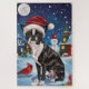This festive design captures the joyful spirit of the holiday season, featuring an adorable pup wearing a Santa hat. The dog is nestled in a winter wonderland, complete with a snowman, a decorated Christmas tree, and beautifully wrapped presents. Snowflakes gently fall, adding a magical touch to the scene, while the vibrant colors of the holiday decorations create a warm and cheerful atmosphere.