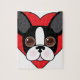 A cute illustration of a Boston Terrier face with a red heart in the background